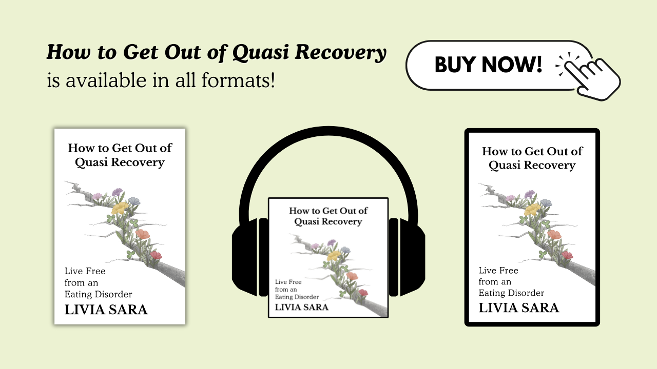 So rather than telling you to smash the scale or stop counting calories or even to take a break from exercise, How to Get Out of Quasi Recovery invites curiosity. I don’t demonize the eating disorder, I don’t claim it to be a demon that must be fought to the death. I don’t even tell you to face your fears in this book! Instead, I completely turn the tables. I invite you to view the ED not as a disorder, but as a powerful adaptation – an adaptive attempt to solve the existential questioning, an adaptive attempt to conform, an adaptive attempt to make this overwhelming world a little more manageable.